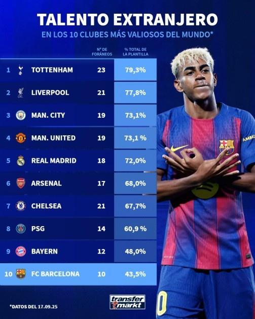 9月18日讯 德国转会市场统计了身价排名前十俱乐部的外籍球员占比,并列出榜单,在身价前十俱乐部之中,热刺外援占比79.3%最高,巴萨43.5%最低。