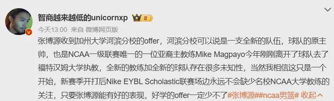 恭喜,恭喜。张博源收获NCAA D1学校UCR(加州大学河滨分校)的offer。