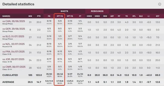 前不久结束的U19世界杯,张博源场均贡献14.7分5.1板1.4断1.1助,除了对阵德国该场比赛由于仅出战约9分钟只得到2分外,其余场次全部得分上双,包括三场得分20+。