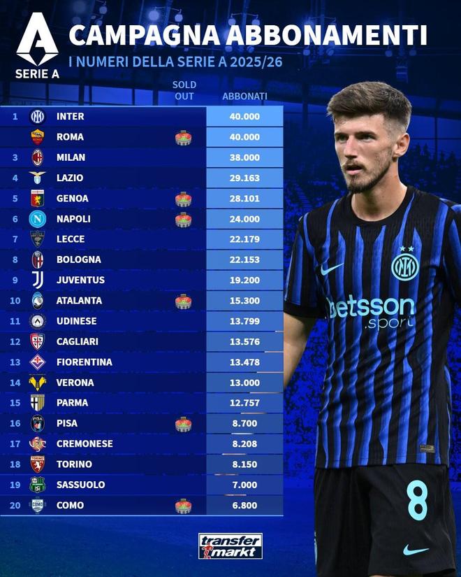 转会市场网统计了2025/26赛季意甲联赛各队季票销售情况,其中国际米兰和罗马以40000张并列排在第一位。