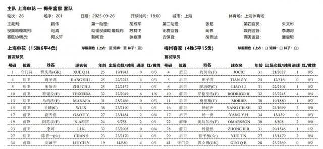 赛前申花51分排名第三,落后榜首3分,梅州17分排名垫底,与身前的亚泰、海牛同分。