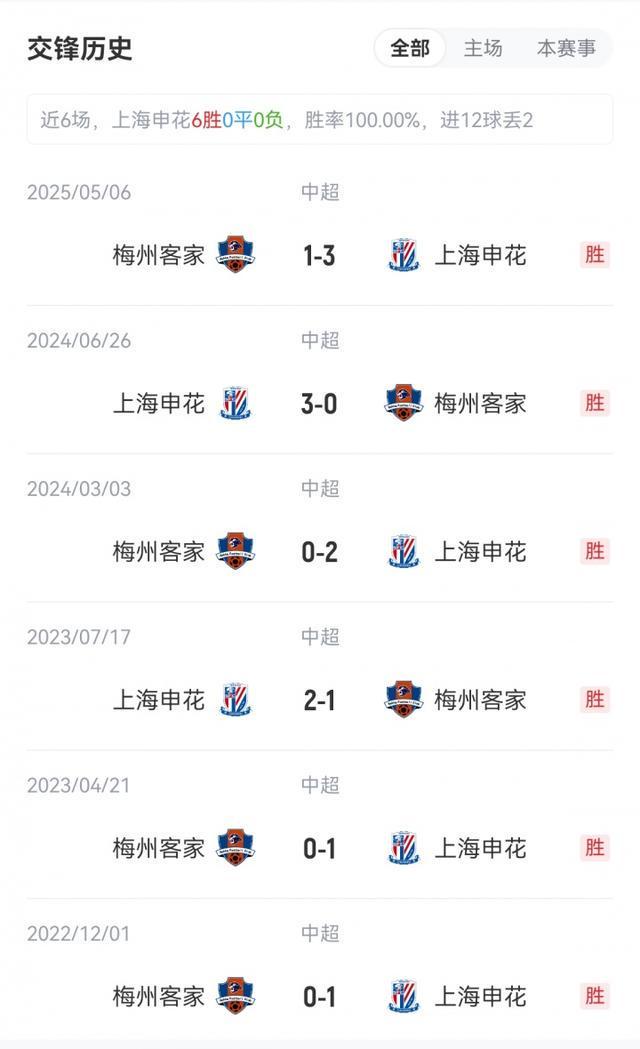 申花近7轮1胜4平2负状态欠佳,梅州近15轮1胜2平12负只拿到5分。历史战绩方面,两队在中超总计7次交手,申花全胜。