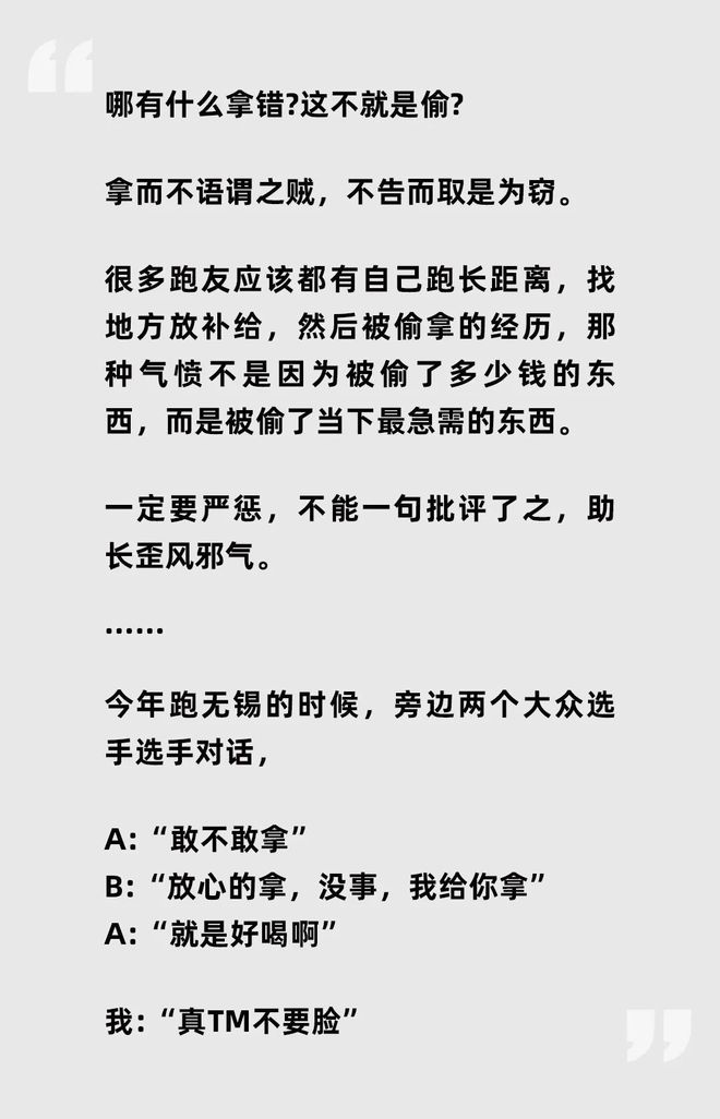 有些跑者认为——衡水湖错拿补给的大众选手是无意的,和苏州环太湖1号公路上有跑者恶意卷走补给站的能量胶事件性质不同。但也有跑者认为,“没有错拿,就是偷窃”。跑者@william也分享了自己在今年无锡的赛道听到的大众精英选手的对话。