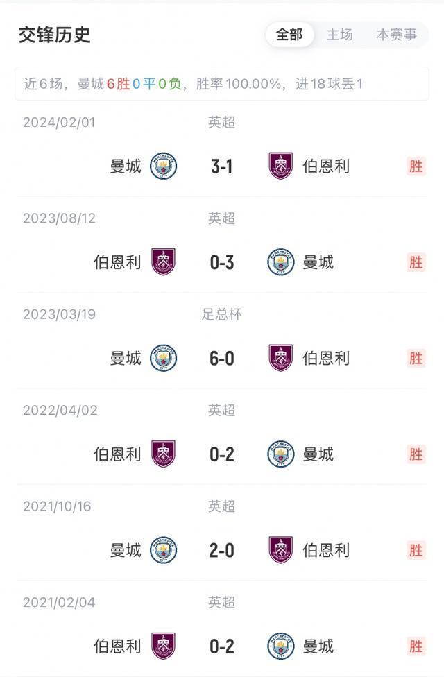 曼城2胜1平2负积7分暂列英超第9,近4场比赛曼城3胜1平保持不败;伯恩利1胜1平3负积4分暂列英超第16,伯恩利英超3轮不胜。