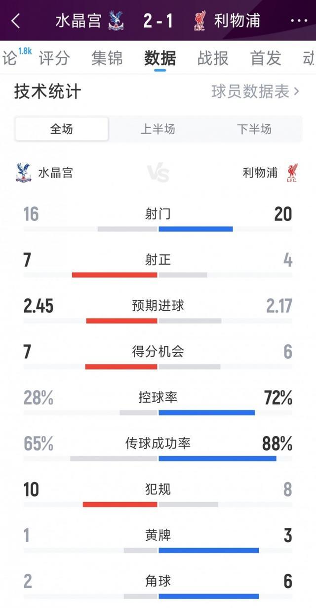 9月28日讯 在本轮英超,利物浦1-2不敌水晶宫。以下为双方全场数据对比: