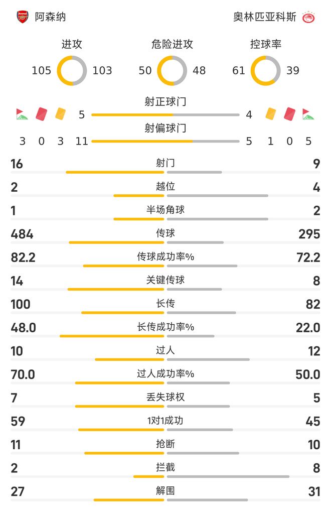 控球率方面,阿森纳达61%,反观奥林匹亚科斯则为39%。传球数据方面,阿森纳全场484次传球,传球成功率达到82.2%;奥林匹亚科斯全场295次传球,传球成功率72.2%。