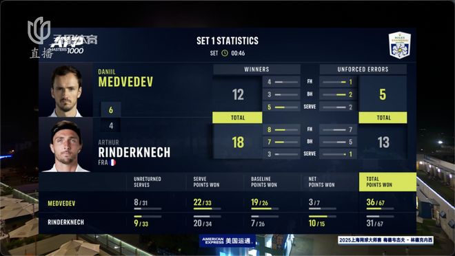 比赛首盘,梅德维德夫在对手的第二个发球局兑现破发点,占得先机。依靠这一个破发优势,梅总第一盘6比4获胜。数据方面,俄罗斯名将的非受迫性失误控制在了5次,而林德克内西出现了13次。底线较量中,也是梅总以19比7占据绝对上风。
