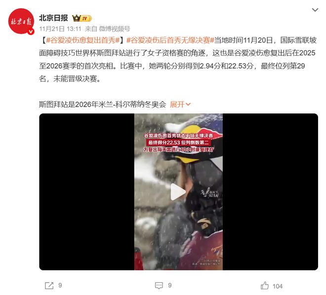 11月20日,坡面障碍技巧世界杯斯图拜站,谷爱凌正式复出,伤愈后的首次亮相其实并不成功,在资格赛中她仅仅位列第29名,未能晋级决赛。直到12月的雪盟联赛崇礼站,谷爱凌才找回状态,拿到U型场地冠军。