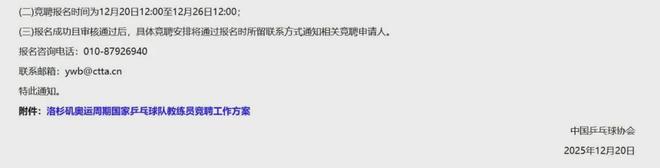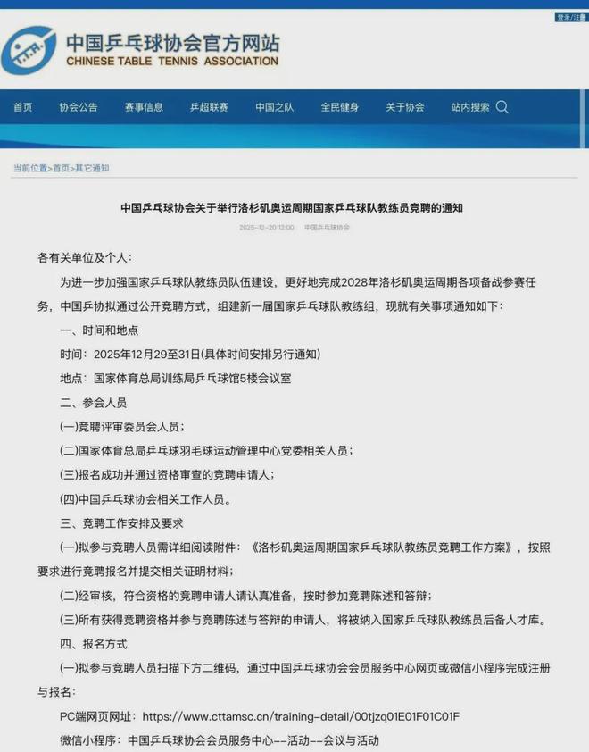 “乒乓世界”消息,中国乒乓球协会官网于12月20日正式发布《中国乒乓球协会关于举行洛杉矶奥运周期国家乒乓球队教练员竞聘的通知》,正式启动新周期国家队教练员公开竞聘工作。