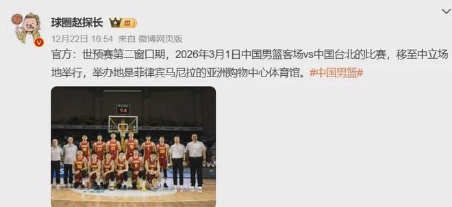 值得一提的是,明年3月1日中国男篮VS中国台北队的比赛,将移至中立场地举办,地点位于菲律宾马尼拉的亚洲购物中心体育馆。至于为什么?FIBA官方尚未给出解释,但懂的都懂,现在的体育运动早已不纯粹,掺杂了太多不可控因素,只能尽量避免。