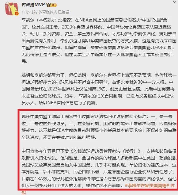 辟谣了。李凯尔目前仍是中国国籍,意味着未来依然有资格代表中国男篮出战FIBA比赛。
