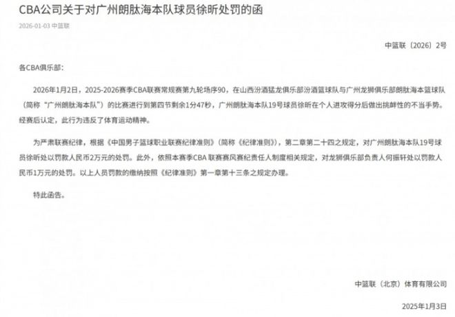 为严肃联赛纪律,根据《中国男子篮球职业联赛纪律准则》第二章第二十四条规定,对徐昕处以罚款2万元的处罚。此外,依照本赛季CBA联赛赛风赛纪责任人制度相关规定,对广州男篮俱乐部负责人何振轩处以罚款1万元的处罚。