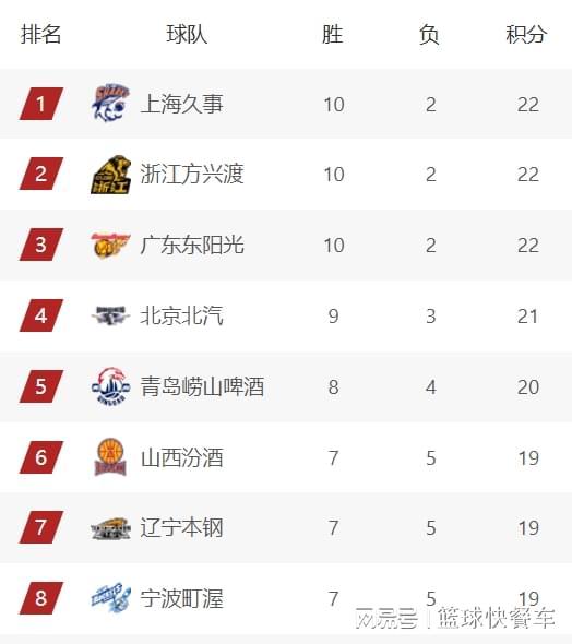排在积分榜第6名的是山西队,他们目前的战绩是7胜5负。而四冠王辽宁队,在经历前阵子的四连败低谷后,球队最近状态不错,接连赢球后,他们已经收获一波三连胜。这一轮比赛击败江苏队以后,他们的战绩也变成7胜5负,又一次回到正轨。目前,辽宁队已经重返积分榜前八,暂居第七名。而排在积分榜第8名的是宁波队,他们目前的战绩是7胜5负。