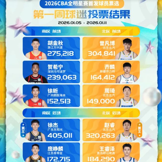 2026CBA全明星赛,首周投票具体情况如下: