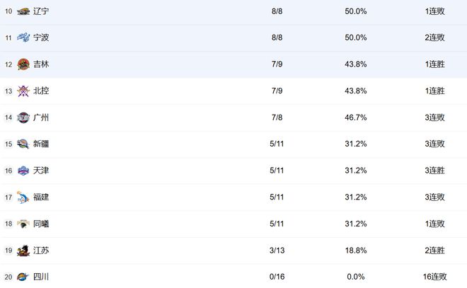 辽宁、宁波排在10和11。现在辽宁的情况非常糟糕,外援和本土球员的水平都不行,他们只能尽可能巩固季后赛的席位。宁波也是8胜8负,但他们已经两连败了,他们欠缺锋线,后续的赛程还比较艰难,看看能不能顶住吧。